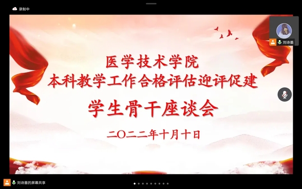 10月10日下午,医学技术学院本科教学工作合格评估迎评促建学生骨干座谈会于线上召开,出席本次座谈会的有医学技术学院团总支书记郭子叶老师、专职辅导员白妞老师及各学生骨干,本次座谈会由学生骨干刘诗墨同学担任主持。