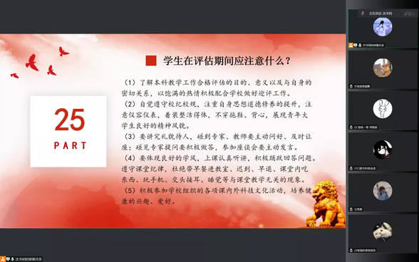 一、评估的概念、意义以及内涵,其中穿插对“专家考评”、“学习风气”、“学生座谈会”等内容的讲解。期间,对于“学生座谈会”的普及尤其令人深刻。会议涉及座谈会的多方面内容,问答包括了从住宿生活到学习风气、社团活动的方方面面。