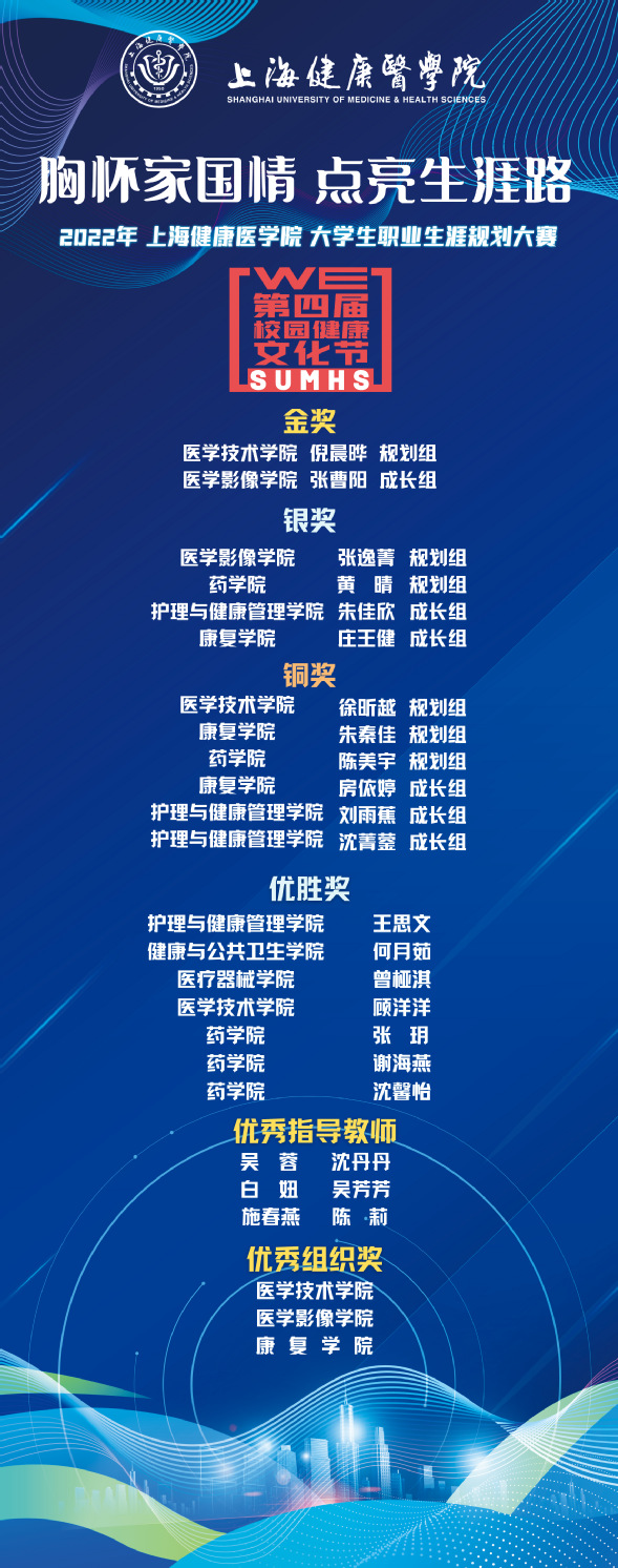 经过激烈的竞争和各环节的评比,根据参赛选手的现场展示和评审专家的综合评分,上海健康医学院学工部副部长慈兴强当场公布本届职业生涯规划大赛决赛获奖选手名单。同时,吴蓉、白妞、施春燕等6人获得“优秀指导老师”荣誉。医学技术学院、医学影像学院、康复学院获得“最佳组织奖”。