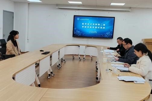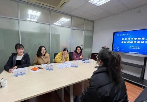 习近平总书记在党的二十大报告中指出:“必须坚持科技是第一生产力、人才是第一资源、创新是第一动力。”上海健康医学院始终坚持学生创新能力培养,“学校积极为复合型医学卓越人才搭建培养体系,整合教学资源,打造研究平台,提升创新能力。”为进一步推动“三全育人”,引导学生成为具备良好的团队合作和组织管理能力、较强创新能力的高素质应用复合型人才,医学技术学院于2月23日下午在北苑4507、4517教室举办第二届卓越创新班面试选拔。周浦医院科研部主任严育忠,医学技术学院党总支副书记关磊,医学检验技术专业学科带头人陈正虎,医学检验技术专业李钠、杨丽君,卫生检验与检疫专业主任陈彦凤,口腔医学技术专业林丹,辅导员郭子叶、白妞参与了此次选拔。
