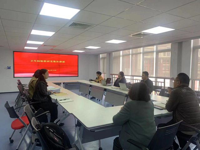 为稳步推进教研室教学改革工作有序进行,做好迎评促建的准备工作。3月16日下午,卫生检验教研室在北苑3号楼4楼平台会议室开展集体磨课专题教研活动。本次教研活动由教研室主任芮闯主持,教研室全体成员参加研讨。学院教学副院长陈凤贞、陈林军莅临现场指导。
