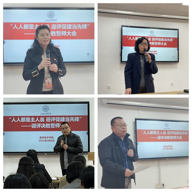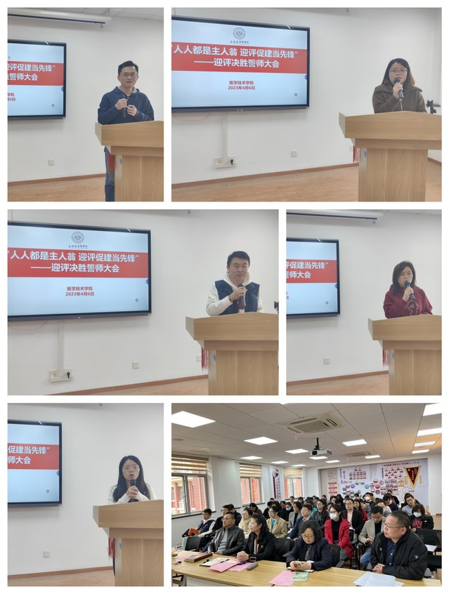 医学检验技术教研室主任金磊、微生物免疫教研室主任聂志妍、眼视光教研室主任周静、口腔医学技术实验分中心主任王凯、辅导员郭子叶等6位教师代表发言。他们信心百倍,坚信学校一定能高质量通过评估,并表达了爱校荣校、全力拼搏的决心。