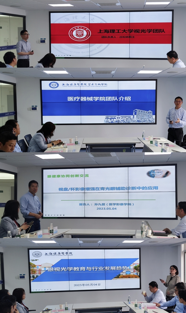5月4日,由上海健康医学院医疗器械学院、医学技术学院、上海理工大学光电学院联合举办的“眼健康数字诊疗技术协同创新研讨会”在北苑3号楼4楼会议室召开。出席本次研讨会的有医疗器械学院院长杨晖、党总支书记李晓欧、医学技术学院党总支书记、院长刘敏娟、医学影像学院副院长姚旭峰、上海市智能医疗器械与主动健康协同创新中心常务副主任周亮、上海理工大学的金涛、王成、项华中、付东翔以及来自我校医疗器械学院、医学技术学院、医学影像学院、护理与健康管理学院的多位专家学者。医疗器械学院临床工程技术学科带头人周传清教授主持会议。