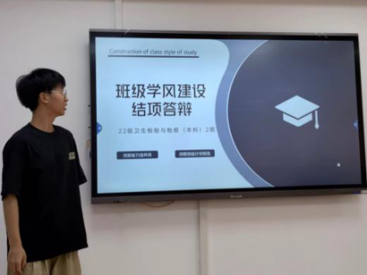 答辩伊始,主持人简单介绍答辩要求和评分标准。紧接着,医学技术学院各班班长按顺序依次上台进行汇报,未能够到场的班级也通过录制视频的方式参与此次汇报。各班级围绕班级基本情况、项目建设方案、项目建设各阶段验收成果和项目结项情况等方面进行总结汇报,并提出项目未来发展的展望。