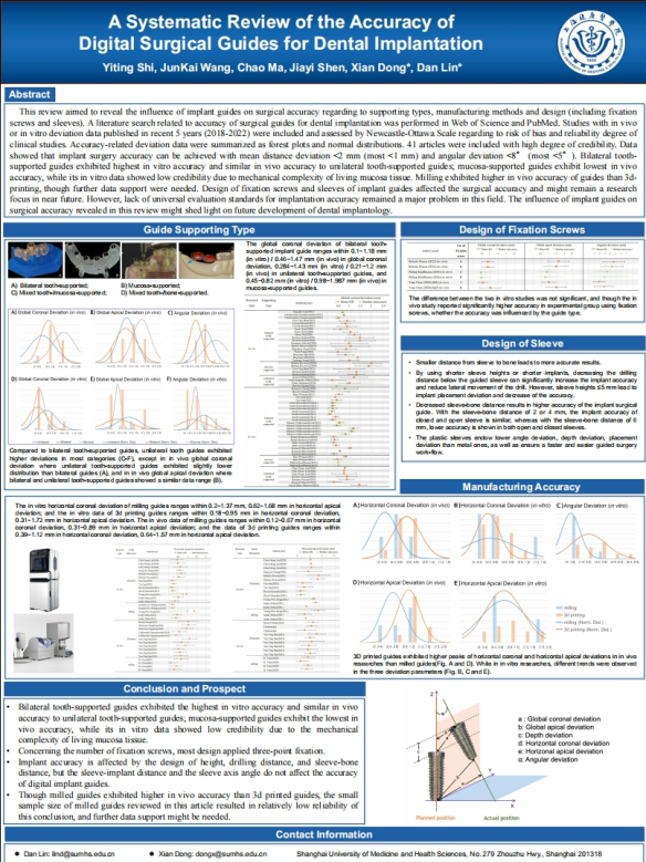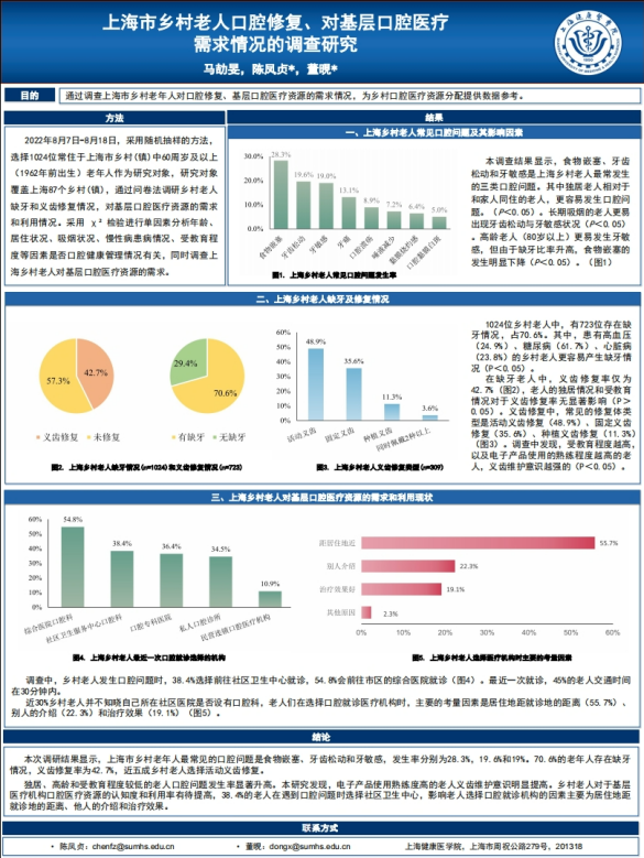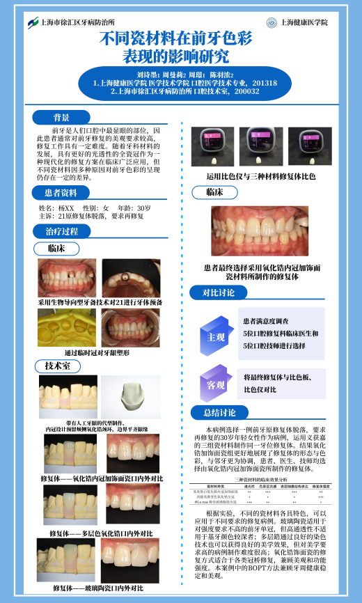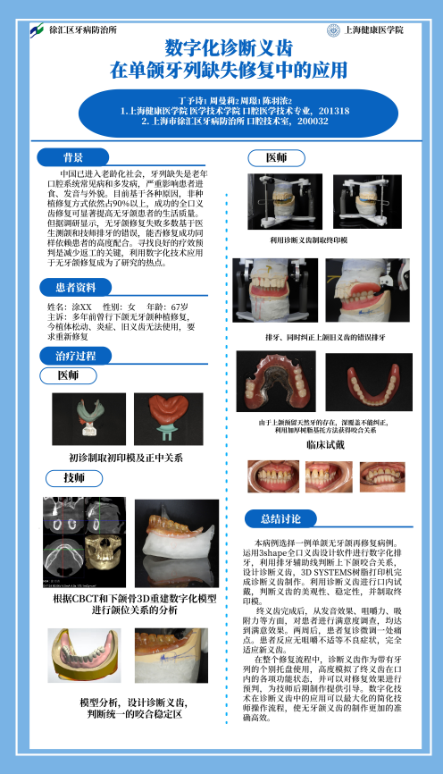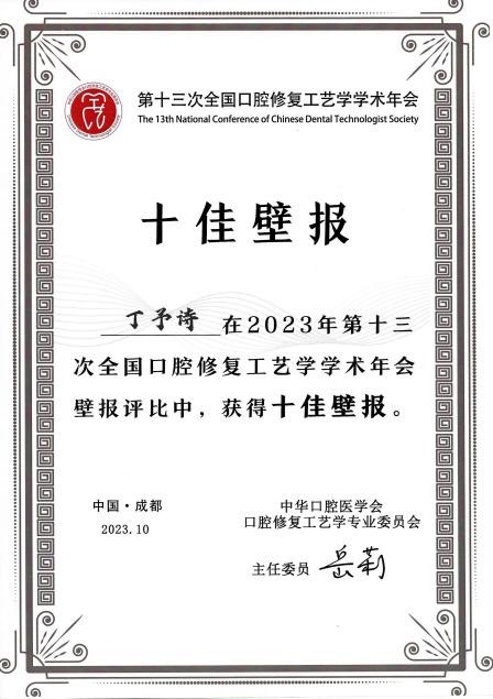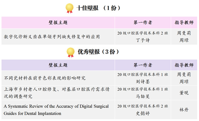 本次会议我校获奖的4份壁报,3份选题来自2024届口腔医学技术专业毕业论文的课题,1份来自校级暑期社会实践成果,其中2份是我校与实习基地徐汇区牙病防治所联合投稿。首次组织本科生投稿国家级学术会议就取得了这样的成绩体现了口腔医学技术本科人才培养的升级转型,即由原来的针对口腔工艺岗位的技能型人才转型到面向口腔全产业链的应用型、复合型人才。