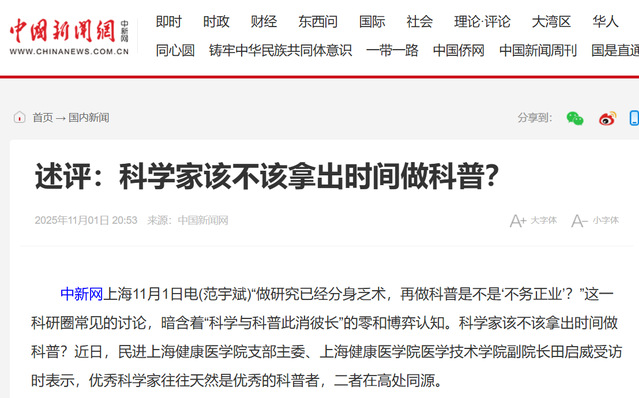中新网上海11月1日电(范宇斌)“做研究已经分身乏术,再做科普是不是‘不务正业’?”这一科研圈常见的讨论,暗含着“科学与科普此消彼长”的零和博弈认知。科学家该不该拿出时间做科普?近日,民进上海健康医学院支部主委、上海健康医学院医学技术学院副院长田启威受访时表示,优秀科学家往往天然是优秀的科普者,二者在高处同源。