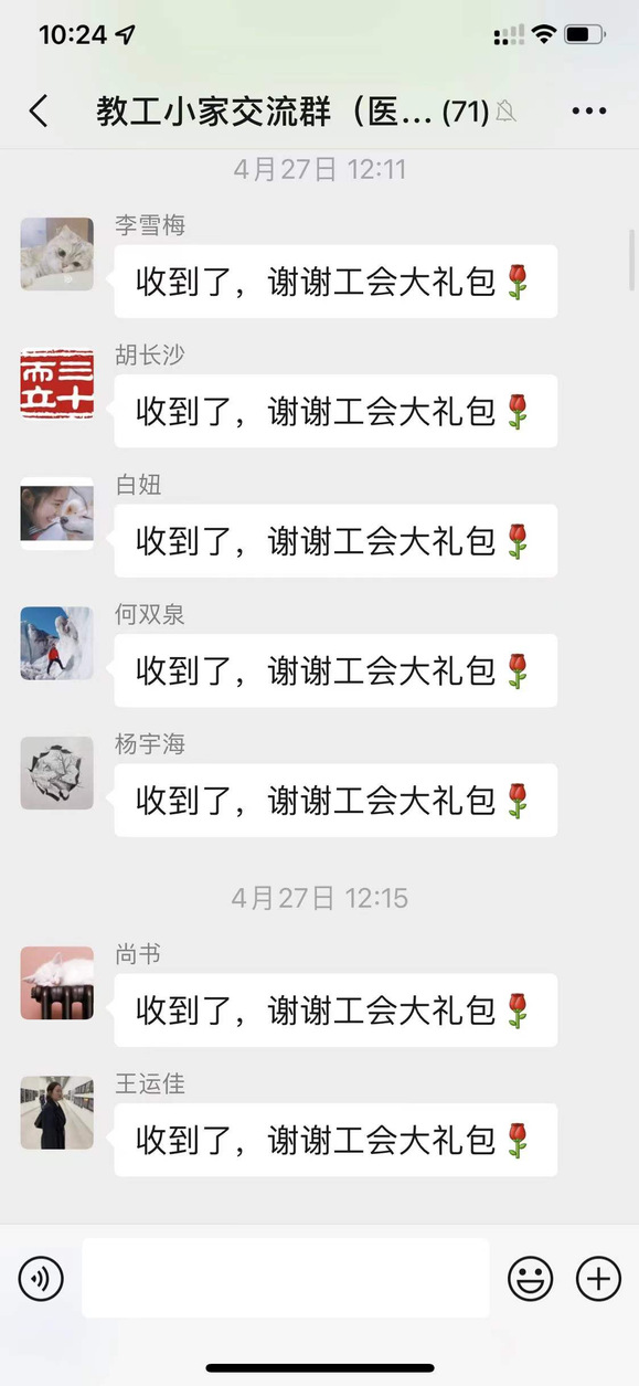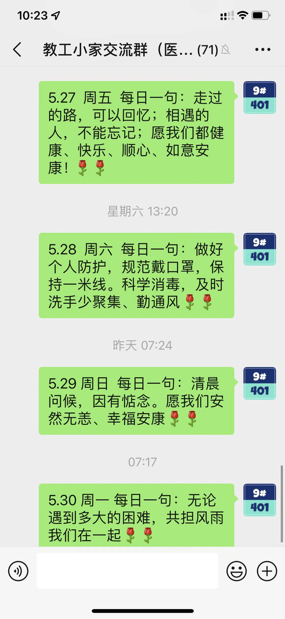 与此同时,医技学院工会也时刻不忘关心职工,关爱教师。从疫情伊始至今,学院工会主席陆俊杰同志每天早晨都会在工会群中发布一条关爱、勉励的信息,鼓励大家携手同心,共抗时艰。各位工会委员们也没有闲着,疫情期间一直关心关爱学院老师们的日常生活,及时了解到有困难老师的情况,并想办法解决。