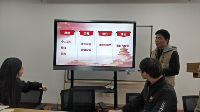 在庆祝新中国成立70周年之际,制定印发《新时代爱国主义教育实施纲要》,对于引导全体人民弘扬伟大的爱国主义精神,为实现中华民族伟大复兴的中国梦不懈奋斗,具有非常重要的现实意义和深远的历史意义。会上,胡长沙带领大家学习了《新时代爱国主义教育实施纲要》。《纲要》共有六个部分、34条,大体上可以分为三个板块。第一板块包括新时代爱国主义教育的总体要求和基本内容,第二板块包括新时代爱国主义教育的群体对象、载体手段和氛围营造,第三板块是新时代爱国主义教育的组织保障。郭子叶老师结合近期国内热点事件、饭圈女孩等,阐明了“爱国,是人世间最深层、最持久的情感,是一个人立德之源、立功之本。”学生党员金明、曹金兰、徐斯琦、颜家诚结合学习和生活,重点谈了如何从学生党员的角度把爱国这个宏大的时代主旋律落实、落地、落小。