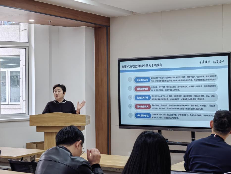 党总支书记姚谷芳领学了《新时代高校教师职业行为十项准则》和高校教师职业行为“十不准”,她指出,“十项准则”和“十不准”是行为底线和职业红线,是全体教师日常开展教育教学、学术科研等工作的基本遵循。随后,姚谷芳结合教师师德失范典型案例,深入剖析案例背后的思想根源、行为危害与深刻教训,用“身边事”警醒“身边人”。她强调,党的十八大以来,以习近平同志为核心的党中央高度重视教师队伍建设,特别是师德师风建设。希望全院教职工要始终坚守底线,不越红线,以“捧着一颗心来,不带半根草去”的精神投身教育事业。