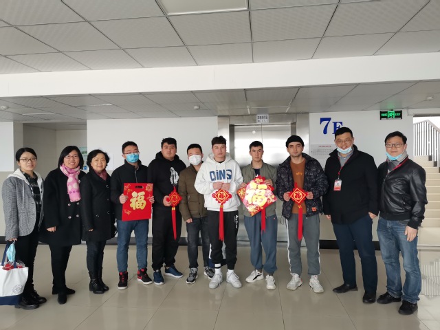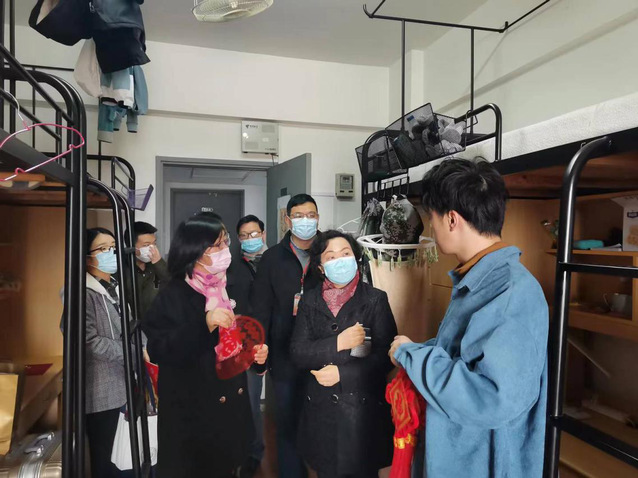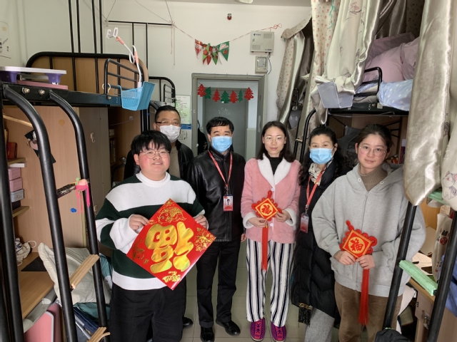 “老家是哪里呀?实习工作怎么样?工作找好了吗?记得做好防护!”李明磊副书记亲切地关怀学生。“感谢你们对学校抗疫工作作出的贡献。不回家过年父母担心吗?请告诉父母,学校会保障好你们的安全和生活,让他们放心!”各位领导、老师询问了留校同学的情况,并嘱托学生要合理安排好实习,加强锻炼,充实假期生活,同时强调严格遵守防疫要求,注意人身安全。各位老师还与同学们一起给宿舍布置上象征吉祥如意的中国结和福字,祝愿大家度过一个祥和温馨的新春假期。
