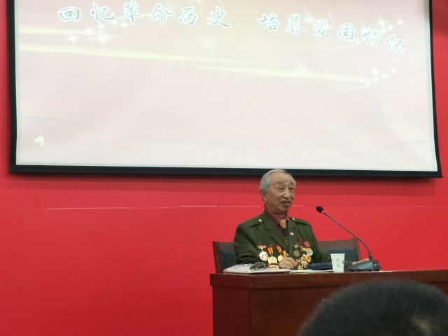 刘石安爷爷为原“沙家浜”部队老兵,参加过朝鲜战争,今年已经87岁高龄,现任上海新四军“沙家浜”部队历史研究会会长。虽已高龄,但依旧幽默风趣,声如洪钟,精神矍铄。讲座开始后,结合我校医学院校的特点,刘老将军特意给我们讲述了一位抗日战争中仁济医院张贤的事迹,1939年当抗日的烽火燃遍华夏大地,张贤医生得知常熟地区有一支新四军游击队,缺医少药,需要医生。他主动放弃了优越的生活条件,舍家抛业与妻子义无反顾前往为游击队治疗的义举,最后为了掩护战友转移而壮烈牺牲的动人事迹。鼓励我们医学生,一定要时刻以国家和民族的复兴为己任,贡献属于医学生的力量。