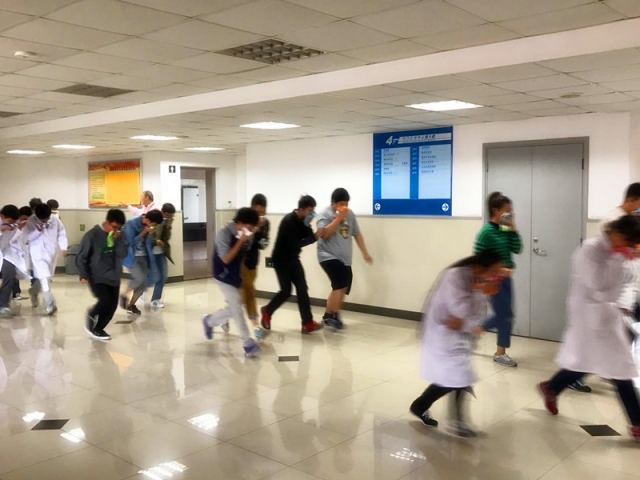 学院办公室主任朱达沅老师主持并宣布2016年医学技术学院师生消防演习开始。随之,实训室内突然涌出滚滚浓烟,学生发现火灾险情,立即拨打消防电话报警(模拟),保卫处立即启动疏散预案。同学们在实训老师的指导下,用湿毛巾捂住口鼻从实训楼迅速撤离,安全有序地跑到实训楼外侧空地集中,师生们从火灾现场安全疏散到空旷处并集合点名完毕仅用了3分钟。与此同时,在场的保卫处工作人员立刻进行了现场险情处置。紧接着灭火实操演习也紧锣密鼓地开场了,大家在保卫处工作人员的现场讲解示范和演示后,都纷纷踊跃上前亲身体验一回灭火器灭火的正确使用方法和威力。最后,基础临床医技联合党总支副书记陆辉作了总结,肯定了本次消防演习活动的效果,同时强调了消防安全工作在师生日常学习生活中的重要性。
