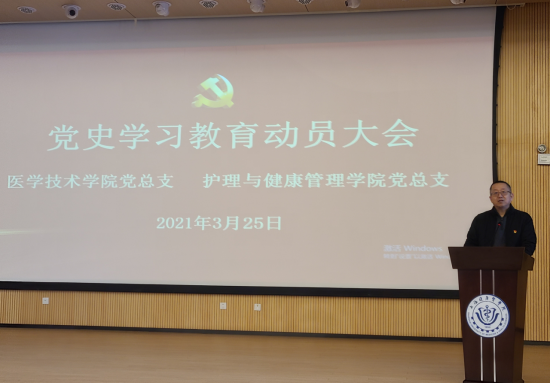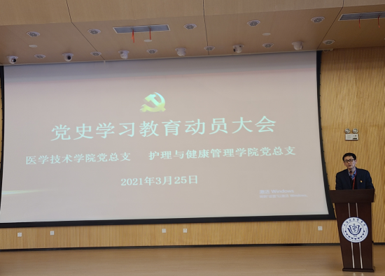 3月25日下午,医学技术学院党总支与护理与健康管理学院党总支在新南苑4号楼一楼300人报告厅联合举办二级学院党史学习教育动员会暨党史学习教育专题报告会。两个学院全体教职员工、学生党员和入党积极分子代表参加学习。会议由护管学院党总支副书记、院长朱爱勇主持。