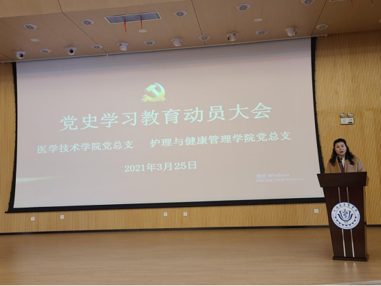 护理与健康管理学院党总支书记汤磊传达了校党委关于党史学习教育有关精神,他重点阐述了开展党史学习教育的背景、意义和三点要求:一要深刻领会习近平总书记重要讲话精神,准确把握党史学习教育的主题主线;二要精准把握重点,用学习成果助力学校“十四五”事业发展开好局起好步;三要切实加强组织领导,确保党史学习教育取得扎实成效。