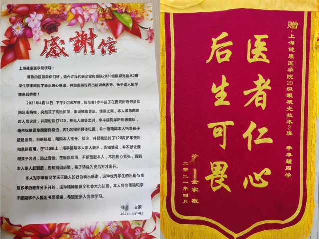 “回想女儿晕倒的那一刻,我不敢想象如果没有李同学的及时相助、女儿不能及时就医,会有什么后果。我们全家非常感激他。”那一晚,徐先生沉浸在感动之中。因为第二天就计划离开上海回山东,他连夜手写了一封感谢信。4月15日一早,他的妻子赶到宾馆附近的文印店,将信打印出来、并制作了一面锦旗,送到上海健康医学院。她向该校医学技术学院党总支副书记高晓霞表达了一位母亲的敬意:“感谢学校,培养出医者仁心的学生!”