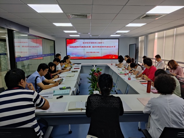 为深入学习贯彻《习近平总书记关于师德师风的重要论述摘编》精神,医学技术学院于2021年6月29日12:00在北苑4507进行了“深化新时代教育改革 提升师德师风建设水平”为题中心组学习。本次学习由院长、书记刘敏娟主持,中心组全体成员出席。