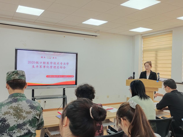 2021年7月2日中午,2020级口腔医学技术专业的半军事化管理总结会在北苑4507召开。医学技术学院副院长陈凤贞老师、党总支副书记高晓霞老师、学院办公室主任兼辅导员苑国栋老师、郭镇才总教官、吕帅教官以及2020级口腔医学技术本科全体同学出席此次会议。本次总结会由2020级口腔医学专业(本科)2班团支书潘妍主持。