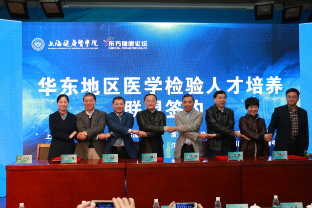 随后,由上海健康医学院分别与上海市临床检验中心、江苏省临床检验中心、浙江省临床检验中心、山东省临床检验中心、安徽省临床检验中心、江西省临床检验中心、福建省临床检验中心签订医学检验人才培养联盟协议,上海市卫生和计划生育委员会副主任衣承东、上海健康医学院党委书记郑沈芳为联盟揭牌。接着由上海健康医学院校领导分别为六省一市临床检验中心的专家颁发兼职教授聘书,希望通过行业专家参与学校人才培养共同提升医学检验人才质量,将人才校内培养与社会行业需求高度融合。