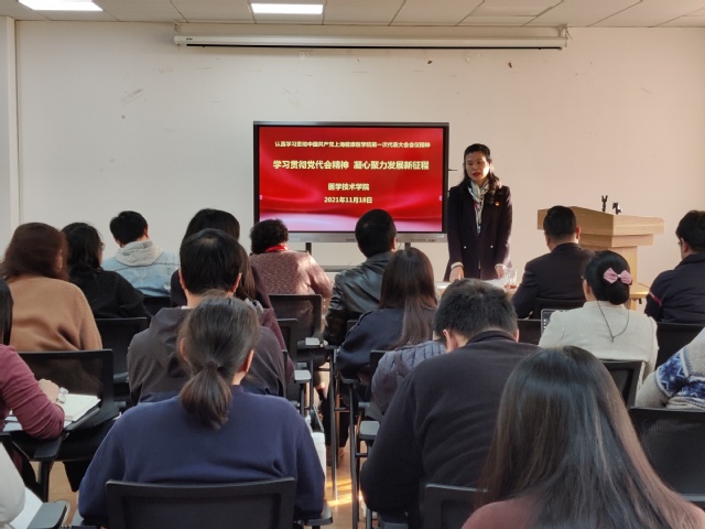 2021 年 11 月 3 日至 5 日, 中国共产党上海健康医学院第一次代表大会胜利召开。按照学校党委的安排部署,11月18日,医学技术学院召开全院大会,认真、全面学习贯彻党代会精神。学习会由学院党总支书记、院长刘敏娟主持。