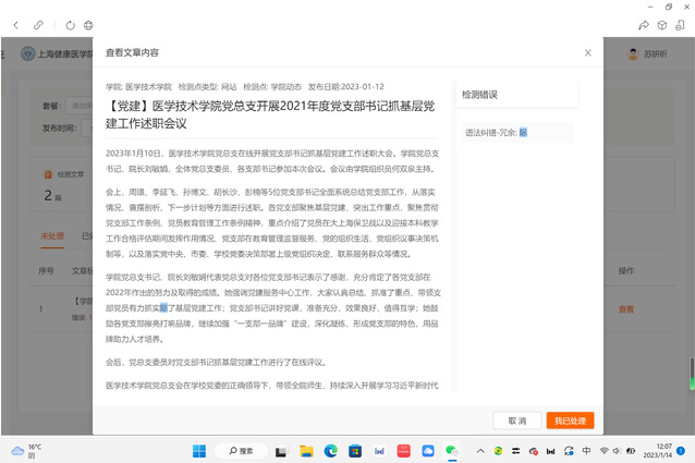 12月30日,医学技术学院党总支在4号楼507开展党支部书记抓基层党建工作述职大会暨学院纪检监察干部工作述职会。学院党总支书记兼院长刘敏娟、全体党总支委员、各支部书记、纪检委员参加了本次会议。