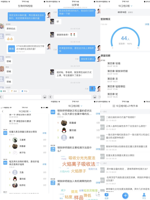 生物材料检验课程线上教学模式主要是以学习速课+课堂互动+测试题形式为主。课程安排如下:1.提前发布课堂教学安排通知;2.课前将本节课的相关资料同步到学习通的班级活动中;3.课上布置本节课需要学习的速课任务点,我也会将本节课需要完成的课程资料同步发布到班级空间中,以便学生更好更方便的链接到学习任务。4.同学们学好速课内容后开始课堂互动,主要以抢答、讨论、发布随堂测试为主。同学们可以及时检验对于课堂知识的掌握情况。同学反馈以线上互动的形式上课,提高了学习的专注度。