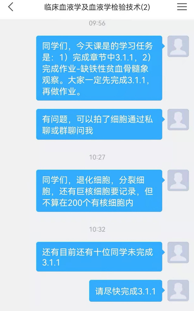 本次实验课准备的重点是高质量缺铁性贫血的数字骨髓片。要求标本片的分辨率高,便于学生用电脑或手机放大观察细胞,还要求其符合缺铁性贫血的骨髓象特征。任课教师充分利用超星平台中相关示范课的数字标本片资源,评估后认为其可用于本次教学任务。然后通过布置作业的方式,将数字标本片和相关实验报告要求发放给学生。并要求学生先学习实验课的讲解视频,知晓相应学习重点后再完成实验报告。且在上课期间,任课教师通过平台与学生保持实时联系。学生在观察骨髓细胞有疑问时,可通过群聊或私聊与教师进行互动。通过这种方式,在不具备光学显微镜的实验条件下,学生利用电脑或手机也能对细胞进行观察与计数,对某些细胞出现辨认困难时也能及时获得教师的指导。教师通过与学生的互动和实验报告的完成情况,能较全面地了解学生的学习情况,可在下一次实验课时作出相应的反馈或调整,以获得更好的教学效果。