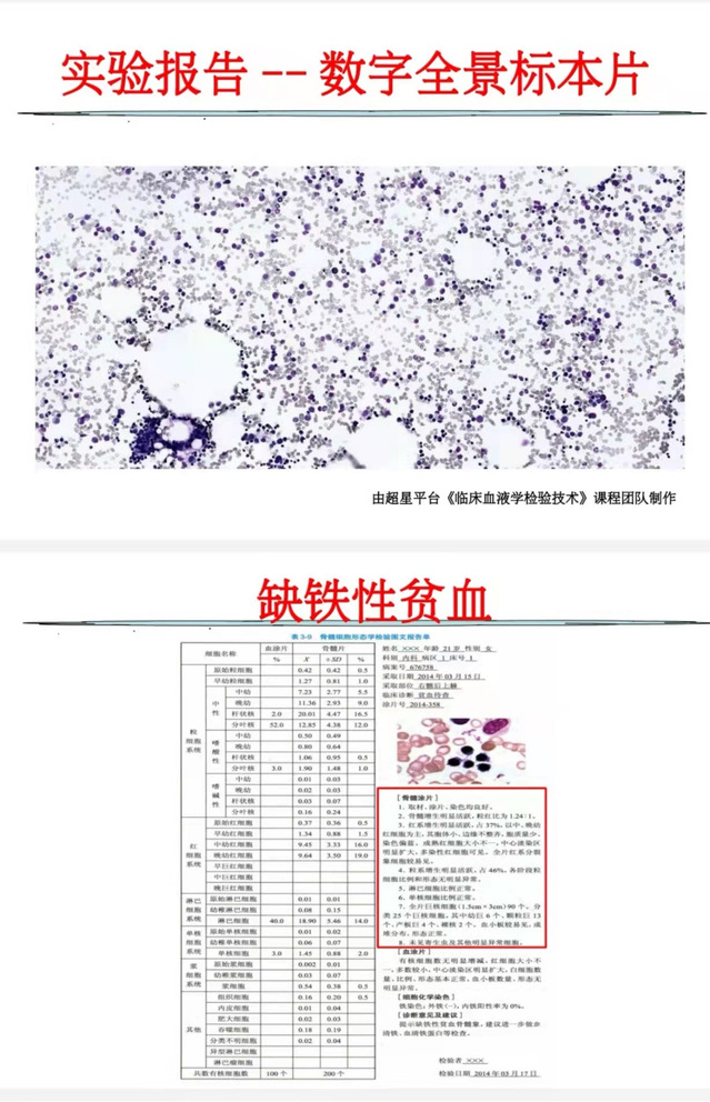 本次实验课的教学内容为缺铁性贫血的骨髓象观察。由于线上实验课容易出现学生无法进行实操练习而参与度低等问题,较难达到期望的教学效果,因此本次实验课进行了预先准备,评估是否有相应的教学资源以便顺利开展线上实验课。